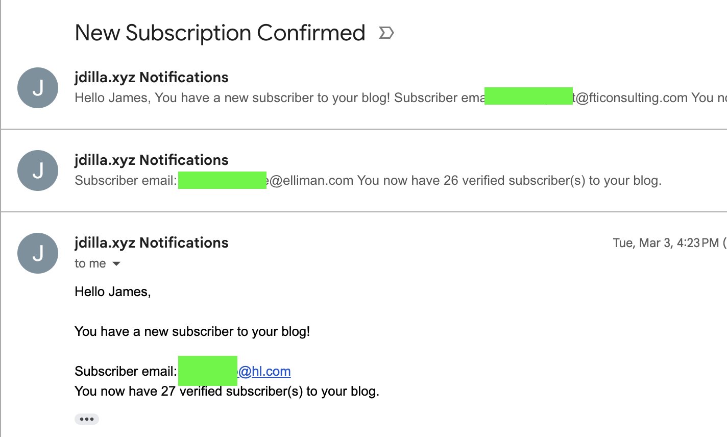 But this week something else happened. I started to see a bunch of new email subscriptions come in, all about one after the other. All people of these people used their business email addresses. I can find most of them on LinkedIn. They seem to be real people… except I have no connection to any of them. They live in places and work on things I have no connection to. Some of them are probably reading this now (👋).